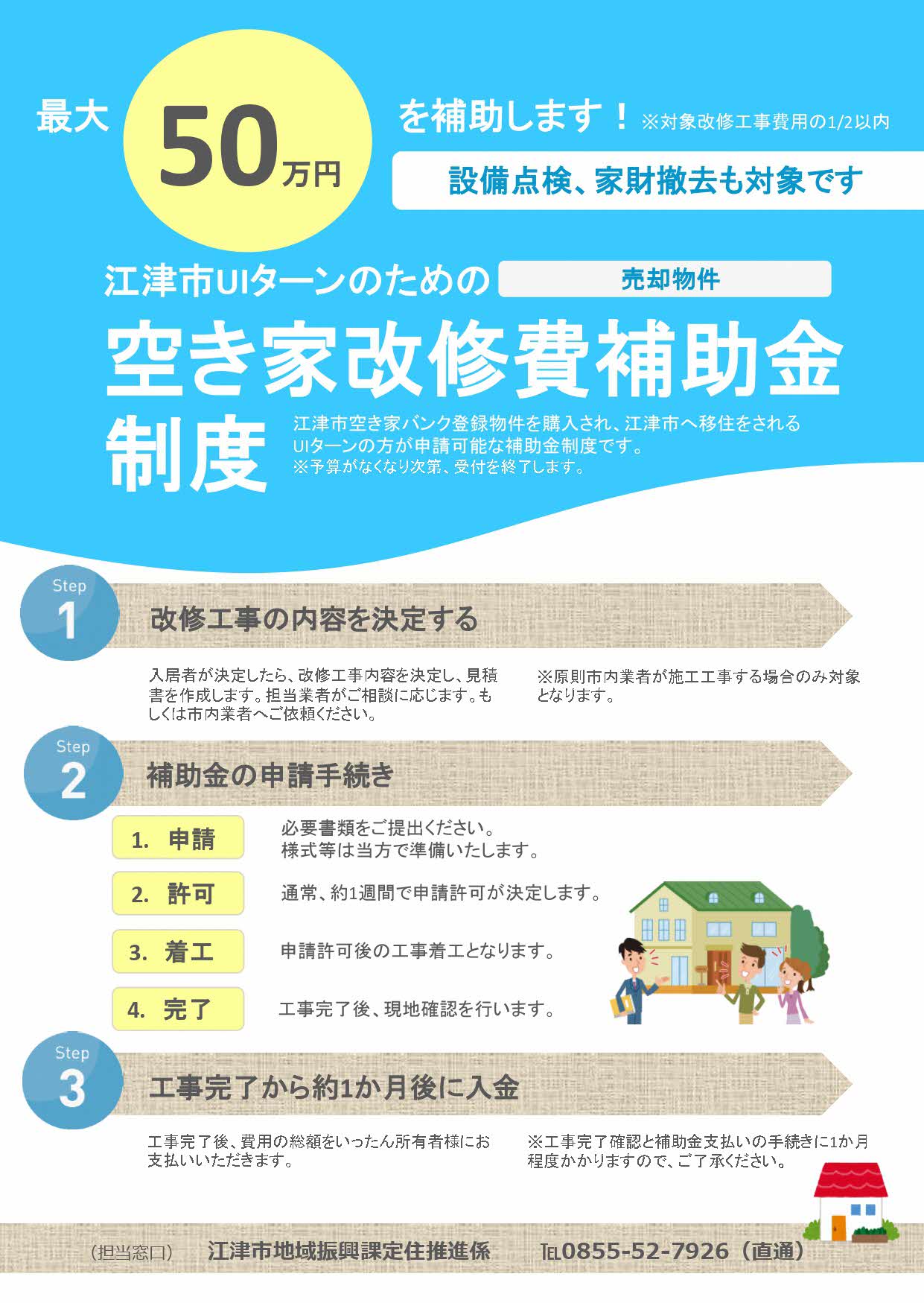 UIターンされる方が江津市空き家バンク登録物件に入居される場合、改修費の一部を補助します。補助額は改修費等の半額、上限50万円です。住居兼店舗として活用される場合は、さらに上乗せの補助があります。