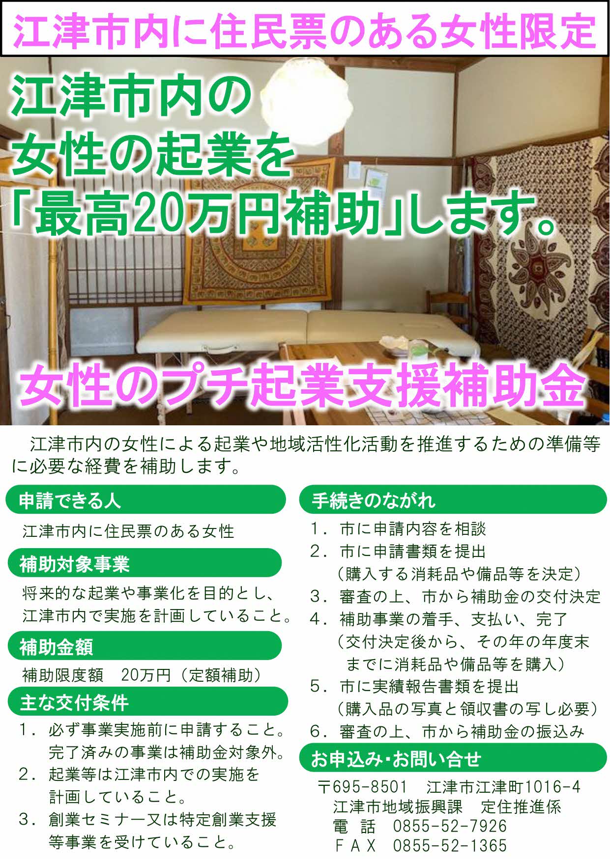 江津市内に住む女性の起業を応援します!あなたのやりたいこと、想いを形にしてみませんか?起業のために必要な経費、1事業あたり上限20万円まで補助します。