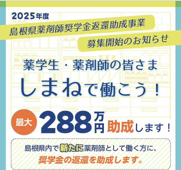 薬学生・島根県外在住の薬剤師が島根県内の登録を受けた医療機関・薬局に就業した場合に、奨学金の返還を助成します!