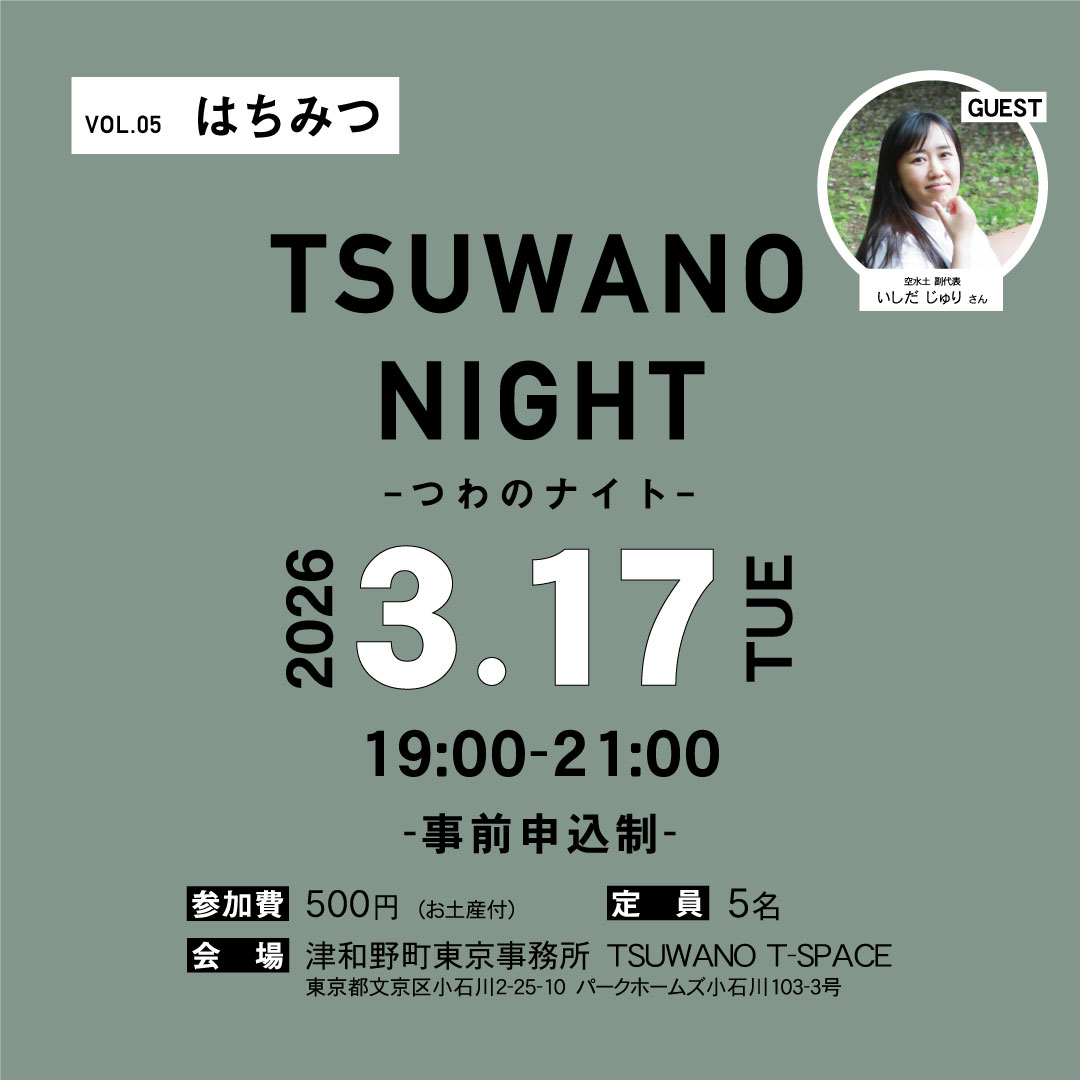 第5回目となる今回は、空水土 副代表ではちみつマイスター&エシカルコンシェルジュである、いしだ氏をゲストに迎え、はちみつの魅力を発見する特別なイベントを開催いたします。当日はまめ茶など津和野町の特産品を楽しみながら語らいます。