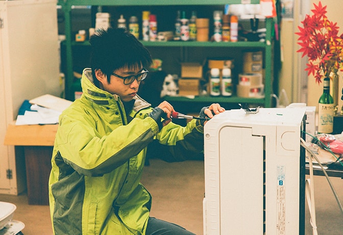 現在は電気機器の設置や修理、配線工事、水道工事など地域の暮らしを支える仕事をこなしている。訪問先ではご近所さんを迎えるような和やかさで、「まあ、ちょっと休憩しながらやりなさいよ」とお茶やお菓子が出されることもある。「地域の人はみんな顔見知り。全員が親戚のような繋がりがあって、僕もそこに入れてもらっているという感じです」