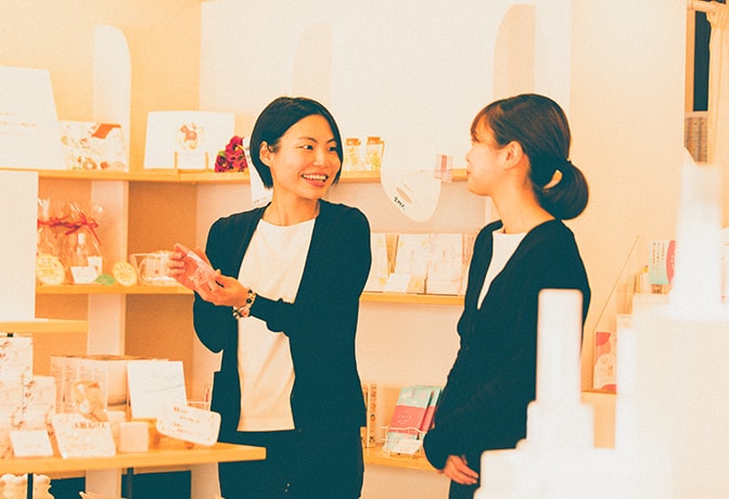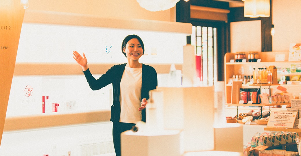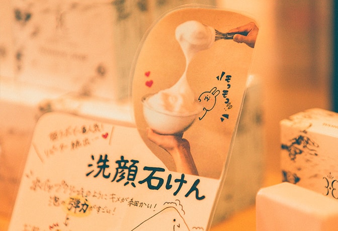 「玉造温泉の魅力を発信して、温泉街にまたにぎわいを取り戻したまちデコの熱い想いに感動しました」と杉谷さん。現在は、「玉造アートボックス」1階の美肌をテーマにしたセレクトショップ「美肌マルシェ」で接客を担当する。訪れてくれた一人一人の気持ちに寄り添い、「皆さんに楽しんでもらえるように」と声のかけ方や接し方に配慮する。「社長と距離が近く、スタッフのアイデアも積極的に聞いてくれます。先輩方もみんなやさしくてアットホームな雰囲気の会社です」と話す。スタッフの自主性を大切にし、それぞれの特技を発揮して活躍する。絵を描くのが得意な杉谷さんは、店頭のポップや通販商品に添えるメッセージカードに、オリジナルのウサギのイラストを手描きして、もてなしの心と感謝の気持ちを届けている。「スタッフは、お客様と仲間への愛が強い人ばかり。どんなに忙しくても笑顔が絶えない楽しい職場です」と語る。
