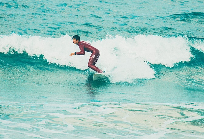 大学では総合政策学部で国際関係や社会経済などを学び、プライベートでは島根の海を満喫している。熱中しているのがサーフィン。地元サーファーの誘いで始め、今は波に乗るのが楽しくてたまらないそうだ。シーズンは秋から冬。「鹿児島の海と島根の海は波の質が似ている気がする。冬の寒さも近いものがありますね」。パワーがある太平洋の波と比べ、日本海は癖のある波が打ち寄せることが多い。「波質に合わせるのは難しいけど、読みがハマってバッチリ技が決まるとヨッシャ!って思います」。サーフィンは自然が相手のスポーツ。表情を変え続ける海に真正面から向き合い、波を掴む瞬間が最高に楽しいそうだ。