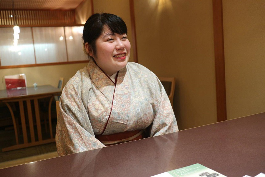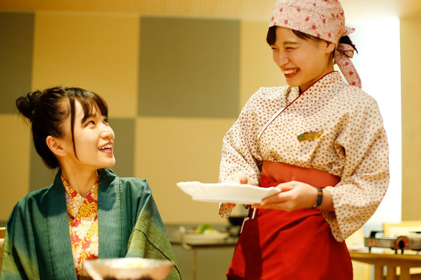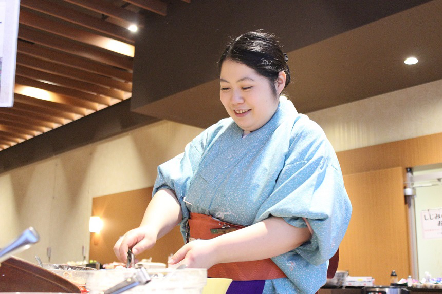 私は入社の時に希望を出して、仲居をさせてもらってます。着物を着て仕事するのに憧れていたので、夢が叶って嬉しいです!仕事内容は、主に宴会や朝食のご提供を担当していて、先輩のお手伝いをしながら仕事を覚えてきました。分からないことや困ったことがあっても優しくサポートしてもらえるので、安心してのびのび働けています。最近は数部屋の宴会を一人で担当できるようになりましたよ。