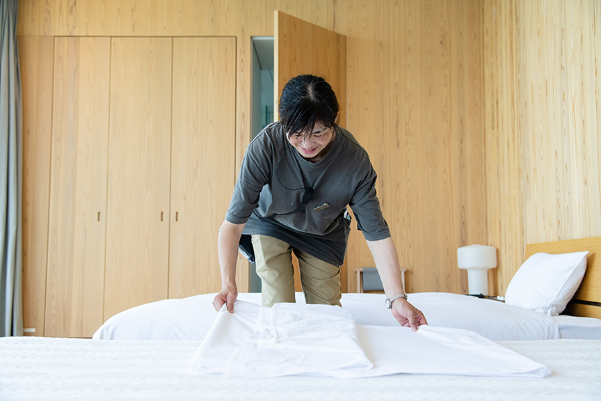 また、宿泊施設の仕事と言えば、客室の清掃等を思い浮かべる方も多いと思いますが、私たちはそのことを「室礼を作りにいく」と表現しており、「どうしたらゲストに良い時間を提供できるか」を常に考えながら向き合っています。Entôで過ごす時間は、島に滞在する体験の中の一部で、施設の状態が島での印象を左右するといっても過言ではありません。