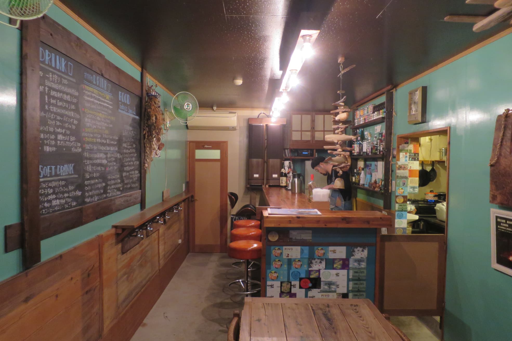 店内はほど良い広さでアットホームな雰囲気が満々。カウンター席で地酒を嗜むのもよし、友人とワイワイするもよし。ほかのお客さんと相席になることがあるので、一期一会の出会いから話に花が咲くことも。そして驚くべきは店内の内装。なんとご夫婦自らDIYで作り上げられたこだわり空間なのです!
