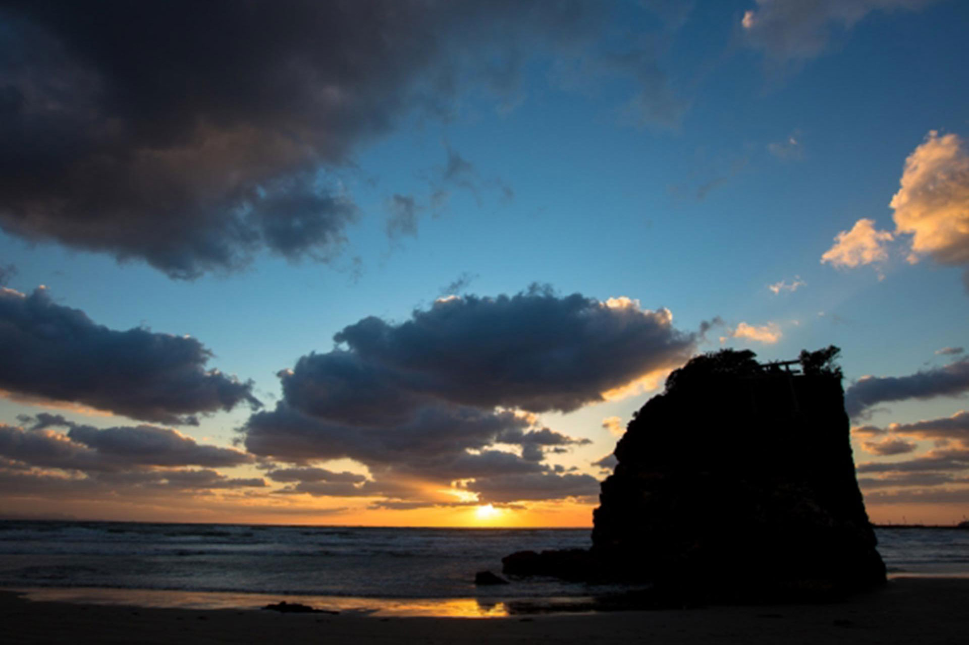 神々が海から出雲へと迎え入れられるとされる神迎神事の舞台で、夕暮れ時に立てば、黄金色の空と日本海の波音が重なり、自然に抱かれるような感覚になります。
