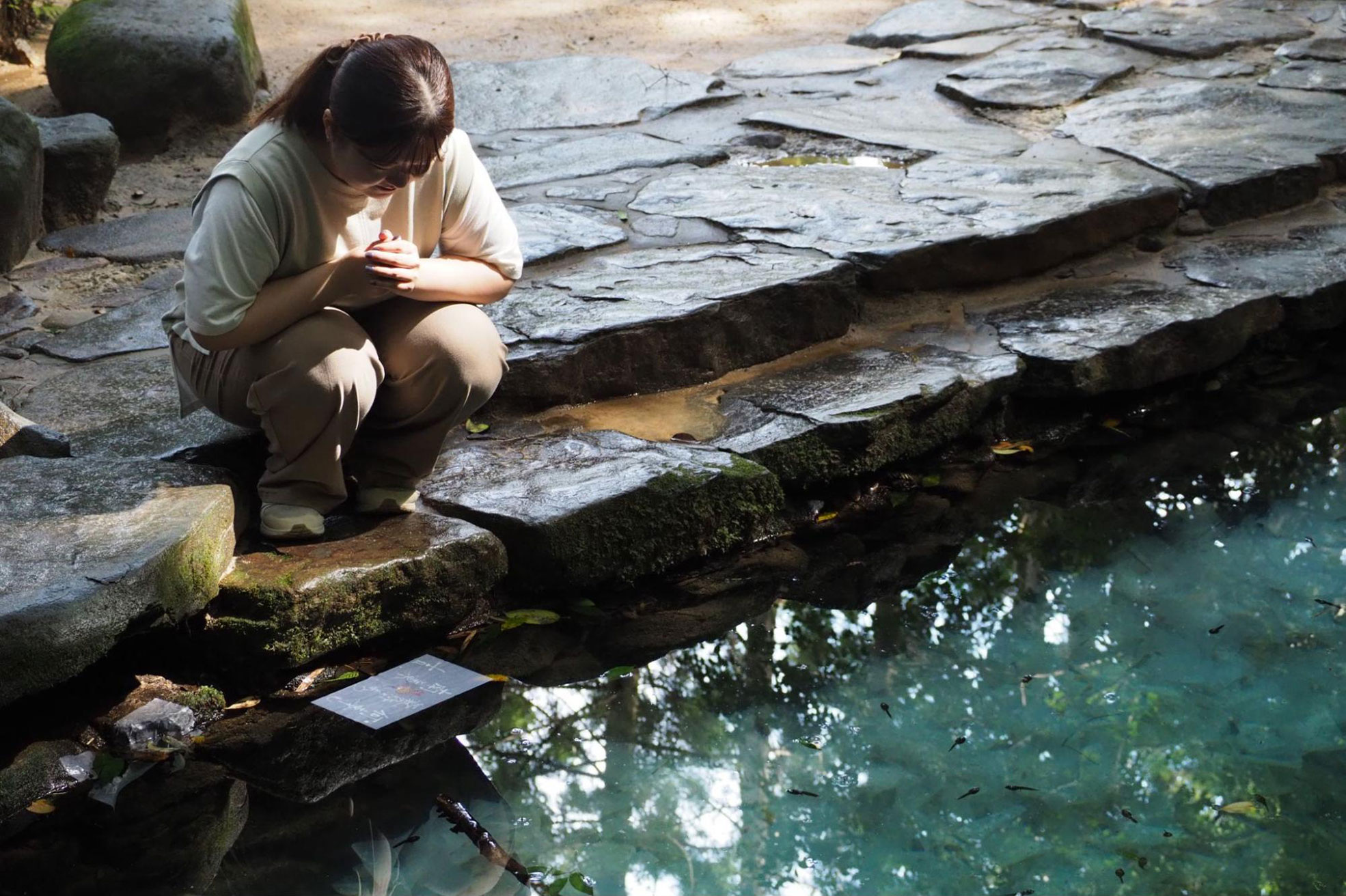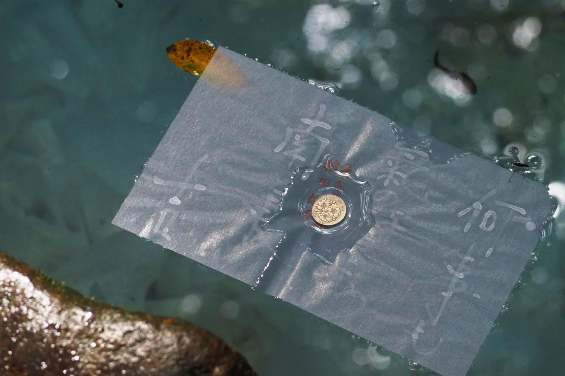 そして、ぜひ体験してほしいのが「鏡の池の縁占い」。紙に硬貨をのせて水面に浮かべお祈りし、沈む速さと距離で縁の行方を占います。早く沈めば出会いも早く、ゆっくりなら時間をかけて結ばれる…近くで沈めば身近な人と、遠くなら遠方の人と結ばれるといわれています。