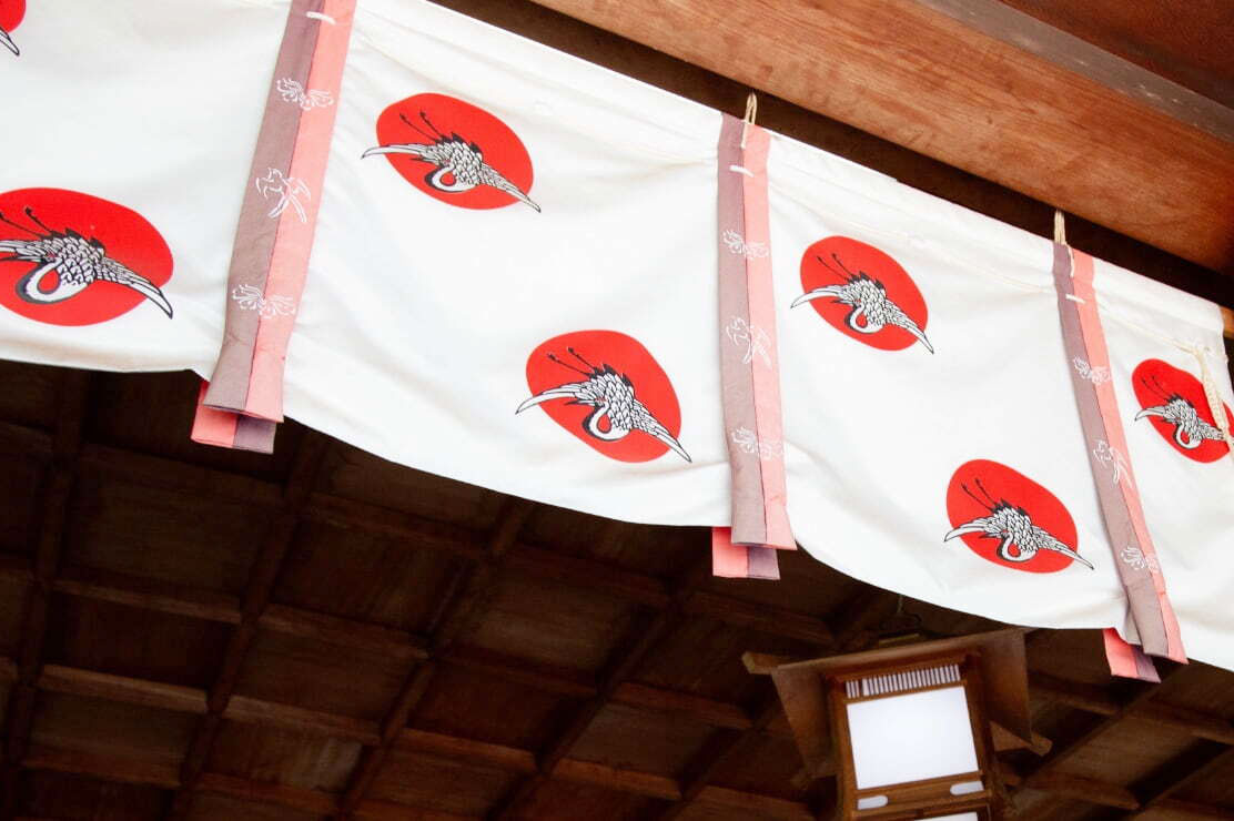御祭神が鶴の背に乗ってこの地に降り立ったといわれ、境内のあちこちに鶴の像や御神紋が見られます。