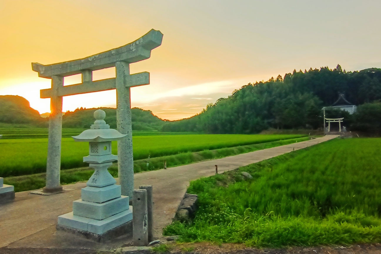 秋になると、黄金色の稲が風に揺れ、夕暮れ時には鳥居がやわらかなオレンジ色に染まります。