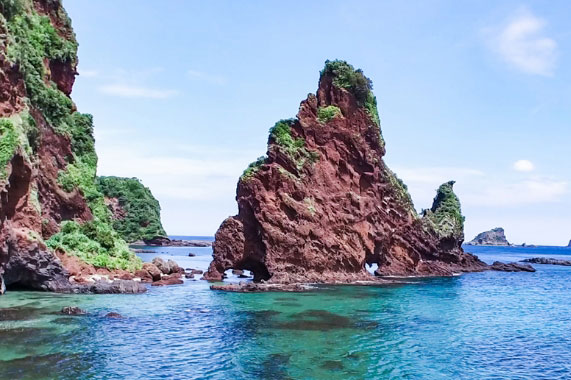 ここには、島の女神が宇受賀命の子を産んだという伝説が残されていて、その時に使った屏風やたらいが、今の屏風岩やタライ岩になったといわれています。目の前に広がる壮大な景色を見ていると、不思議と物語の世界に入り込んだような感覚になります。