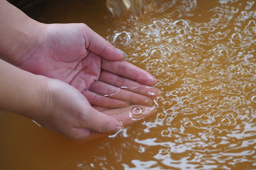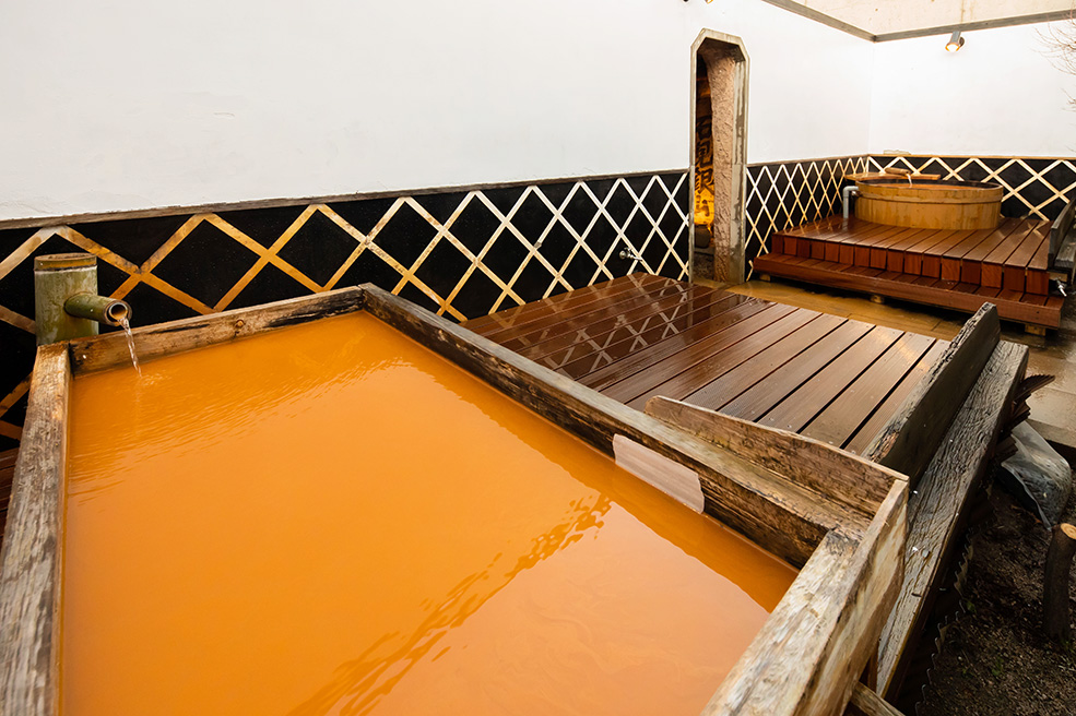 お湯は、茶褐色のにごり湯。塩分と鉄分をたっぷり含んでいて保温&保湿効果が高く、美容成分のメタケイ酸とメタホウ酸の作用も合わさって、しっとりつるつるの美肌効果が期待できるといわれています。