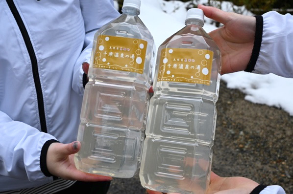 目の前を流れる千原川の畔には源泉を汲める場所があって、温泉水を有料で持ち帰ることができるよ!化粧水がわりに使ったり、お風呂に足せば自宅で温泉気分が味わえるんだそう!