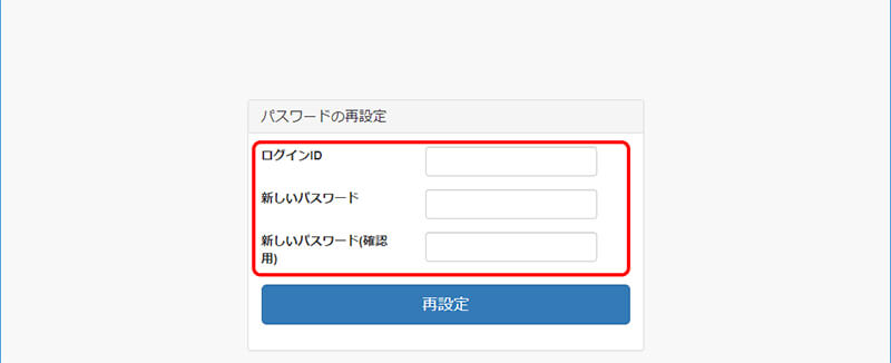 - 5.「パスワードの再設定」画面が開いたら、ログインIDと新しいパスワードを2回入力して「再設定」ボタンをクリックしてください。