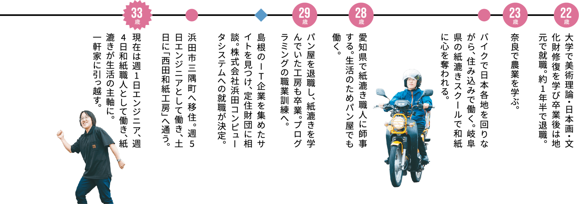 定住財団とのオンライン相談で「ITをメインにしながら、紙漉きに関わりたい」という希望を伝えたところマッチングが成立。浜田市にあるIT企業「浜田コンピュータシステム」への就職が決まり、瀧山さんの島根移住に確かな道筋がついた。生活基盤を確保しながら、休日は紙漉きに時間を費やす。まさに理想の働き方が実現した。